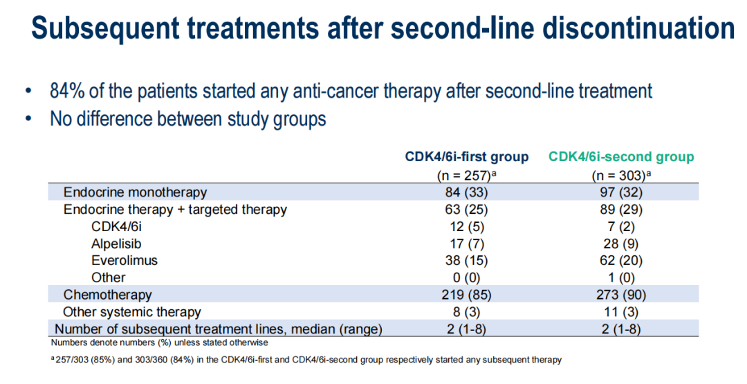 在停止二线治疗的患者中,两组分别有85%(CDK4/6i一线组)和84%(CDK4/6i二线组)接受了后续抗肿瘤治疗,治疗模式相似。未观察到新的安全信号。