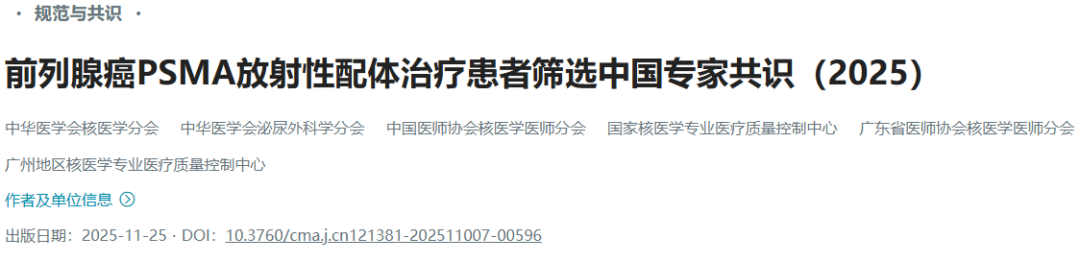 中华医学会核医学分会,中华医学会泌尿外科学分会,中国医师协会核医学医师分会,等.前列腺癌PSMA放射性配体治疗患者筛选中国专家共识(2025).国际放射医学核医学杂志,2025,49(11):735-745.